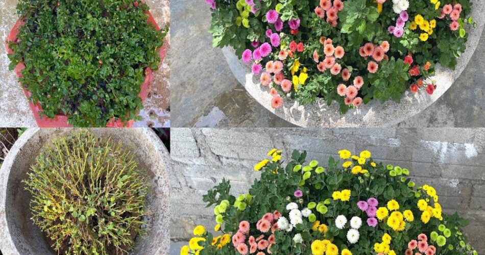 Ein Topf von bunten Chrysanthemen, die ich von wilden Blütenzweigen gepflanzt