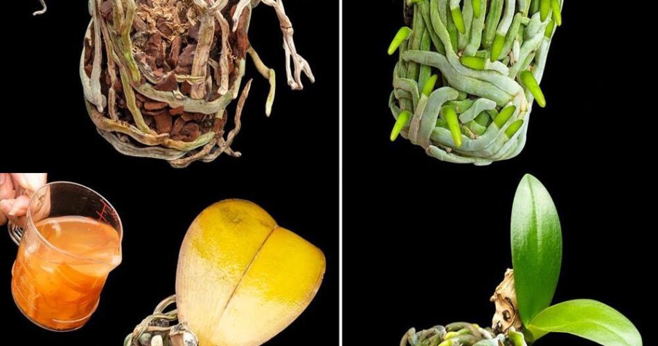 Mit einer Tasse beginnt die verfaulte Orchidee wiedergeboren zu werden und produziert Hunderte neuer Triebe