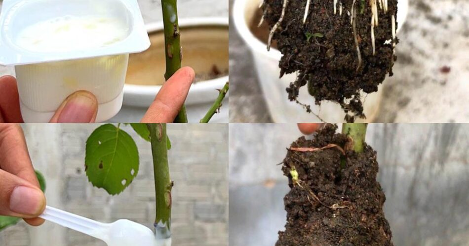 Nur ein kleiner Joghurt, um Rosenwurzeln aus dem Stamm zu wachsen