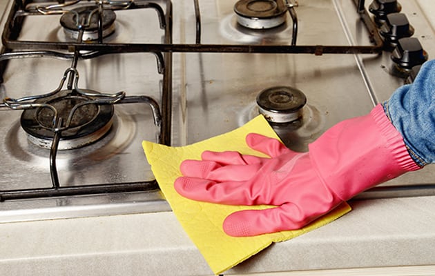 Dazu gehört auch die Reinigung der Arbeitsplatte. Wenn Sie eine Zahnpasta verwenden, die keine abrasiven Bestandteile wie Granulat enthält, können Sie die Oberfläche rund um den Herd besonders gut reinigen.